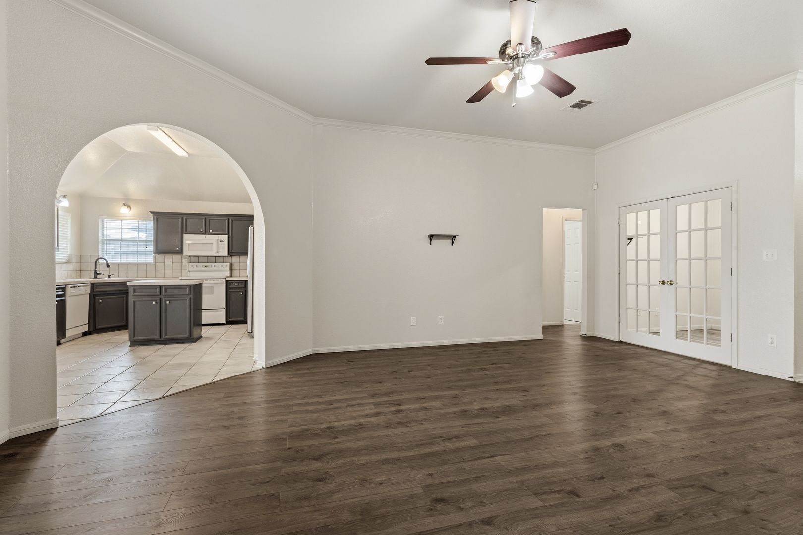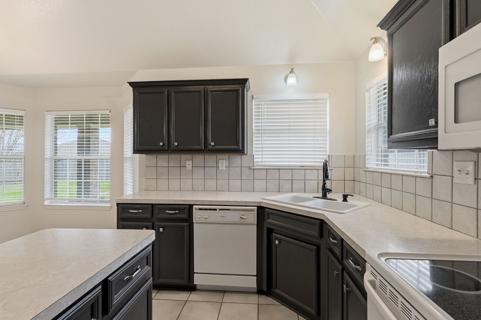 The kitchen is designed for everyday ease with a center island, side-by-side refrigerator, dishwasher, and built-in microwave, all flowing into the main living areas. Durable hard-surface flooring runs throughout the home—no carpet—making for easy upkeep.